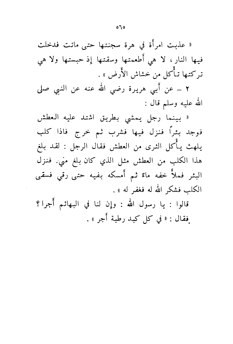 2 - عن أبي هريرة رضي الله عنه عن النبي صلى الله عليه وسلم قال: " بينما رجل يمشي بطريق اشتد عليه العطش فوجد بئرا فنزل فيها فشرب ثم خرج فإذا كلب يلهث يأكل الثرى من العطش فقال الرجل: لقد بلغ هذا الكلب من العطش مثل الذي كان بلغ مني، فنزل البئر فملا خفه ماء ثم أمسكه بفيه حتى رقي فسقى الكلب فشكر الله له فغفر له ". قالوا: يا رسول الله: وإن لنا في البهائم أجرا؟ فقال: " في كل كبد رطبة أجر ".