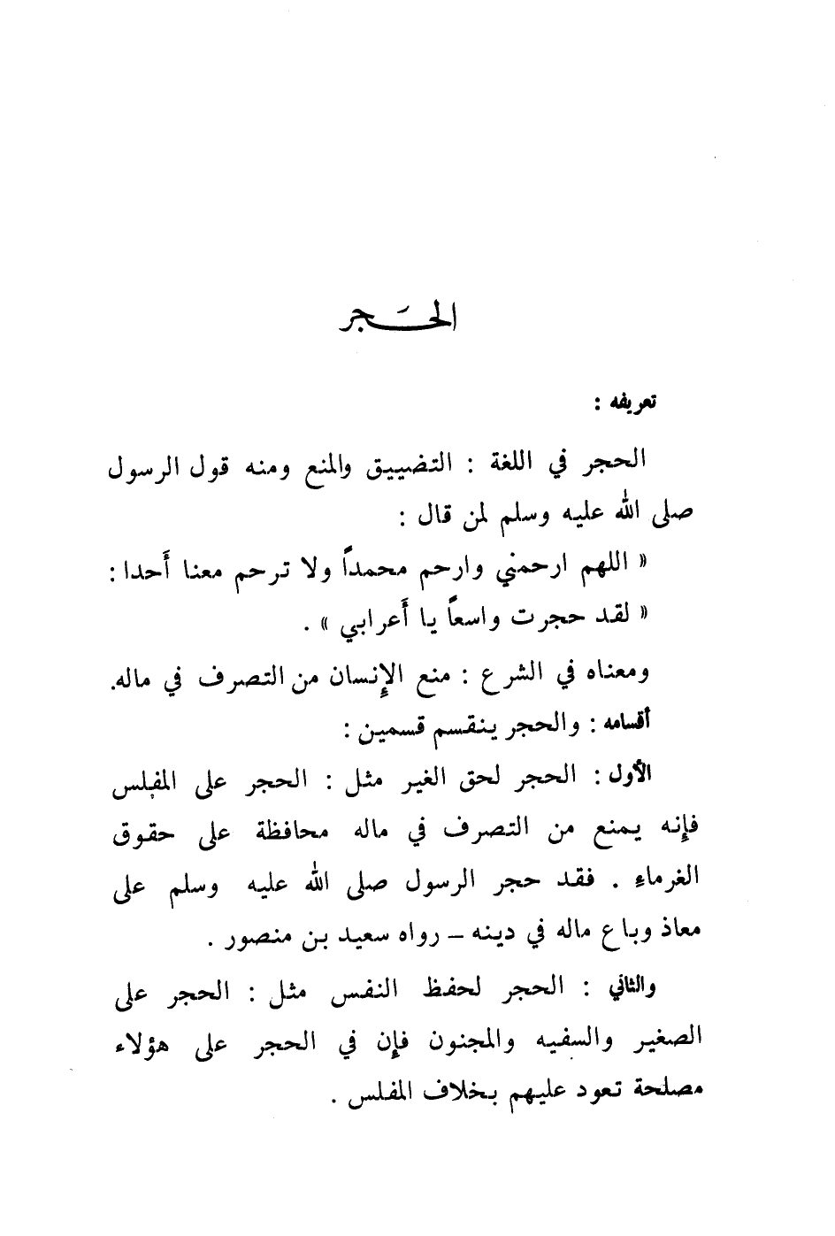 والحجر ينقسم قسمين: الاول: الحجر لحق الغير مثل: الحجر على المفلس فإنه يمنع من التصرف في ماله محافظة على حقوق الغرماء.