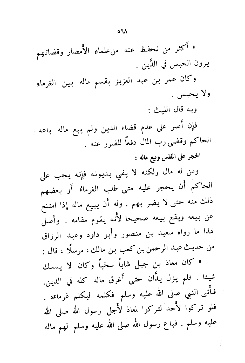 وأصل هذا ما رواه سعيد بن منصور وأبو داود وعبد الرزاق من حديث عبد الرحمن بن كعب بن مالك، مرسلا، قال: " كان معاذ بن جبل شابا سخيا وكان لا يمسك شيئا. فلم يزل يدان حتى أغرق ماله كله في الدين. فأتى النبي صلى الله عليه وسلم فكلمه ليكلم غرماءه. فلو تركوا لاحد لتركوا لمعاذ لاجل رسول الله صلى الله عليه وسلم. فباع رسول الله صلى الله عليه وسلم لهم ماله