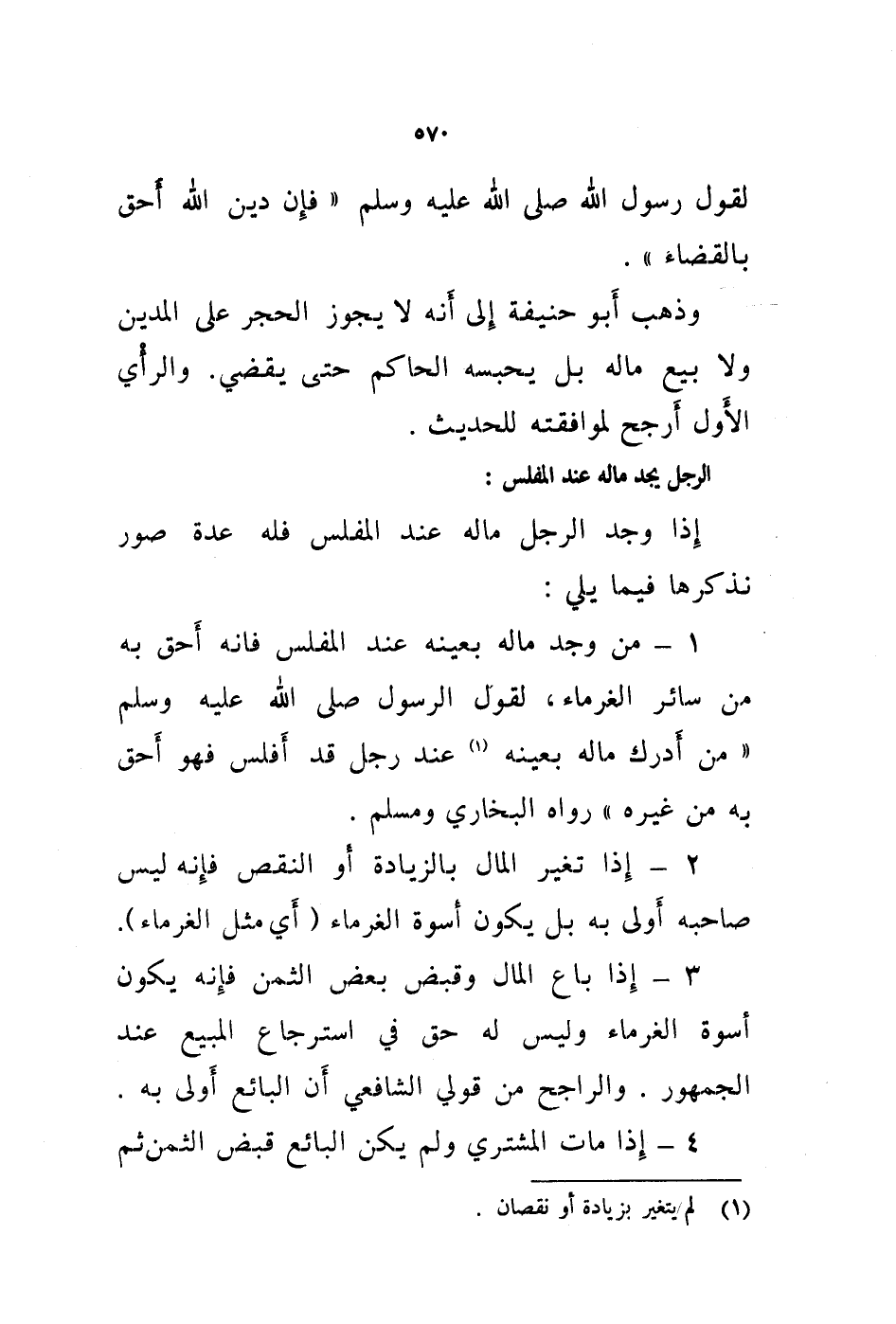 1 - من وجد ماله بعينه عند المفلس فانه أحق به من سائر الغرماء، لقول الرسول صلى الله عليه وسلم " من أدرك ماله بعينه (1) عند رجل قد أفلس فهو أحق به من غيره " رواه البخاري ومسلم.