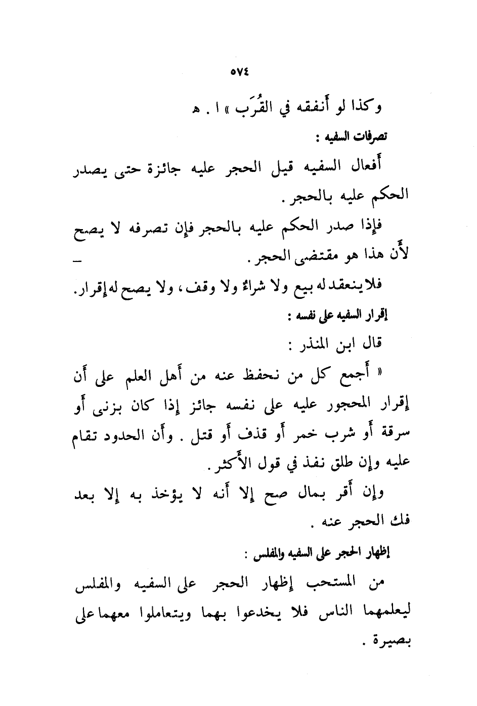 قال ابن المنذر: " أجمع كل من نحفظ عنه من أهل العلم على أن إقرار المحجور عليه على نفسه جائز إذا كان بزنى أو سرقة أو شرب خمر أو قذف أو قتل. وأن الحدود تقام عليه وإن طلق نفذ في قول الاكثر. وإن أقر بمال صح إلا أنه لا يؤخذ به إلا بعد فك الحجر عنه.