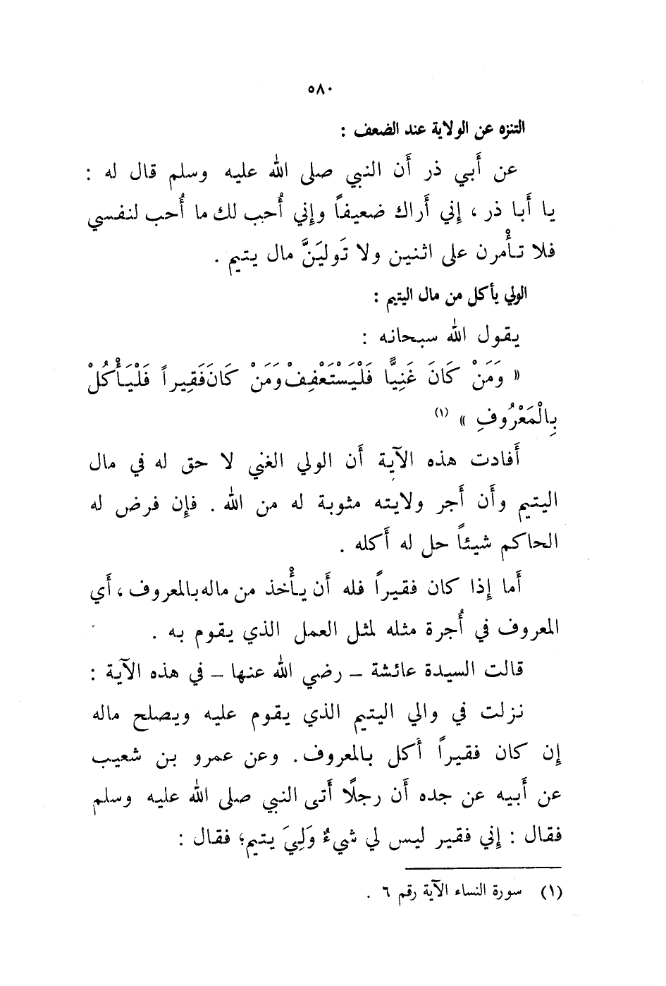 التنزه عن الولاية عند الضعف: عن أبي ذر أن النبي صلى الله عليه وسلم قال له: يا أبا ذر، إنى أراك ضعيفا وإني أحب لك ما أحب لنفسي فلا تأمرن على اثنين ولا تولين مال يتيم.