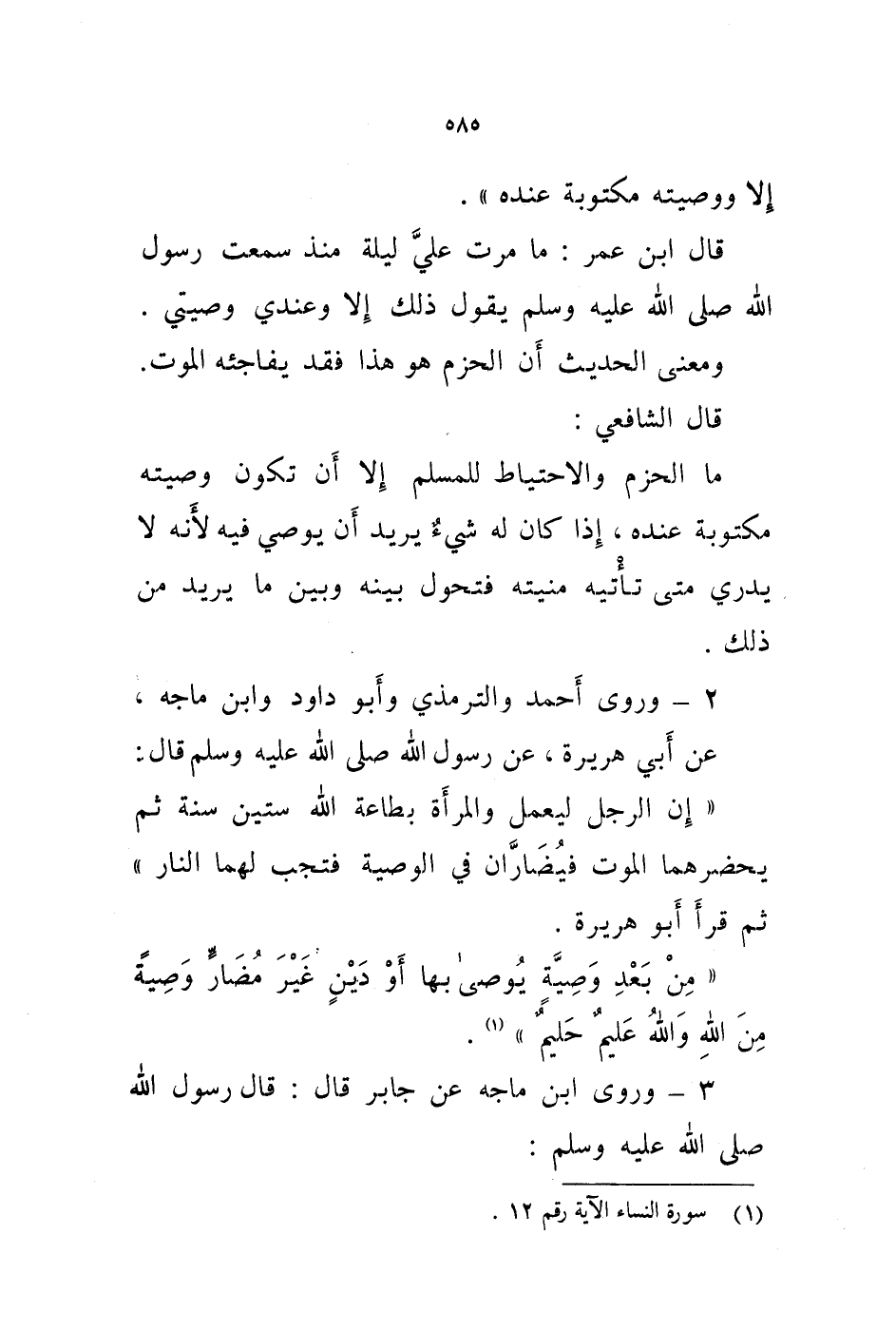 عن أبي هريرة، عن رسول الله صلى الله عليه وسلم قال: " إن الرجل ليعمل والمرأة بطاعة الله ستين سنة ثم يحضرهما الموت فيضاران في الوصية فتجب لهما الثار ثم قرأ أبو هريرة. " من بعد وصية يوصى بها أو دين غير مضاروصية من الله والله عليه حليم " (1) .