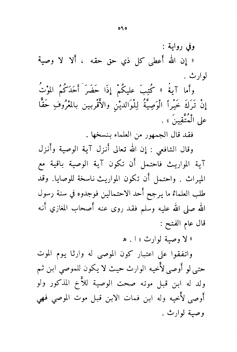 وقد طلب العلماء ما يرجح أحد الاحتمالين فوجدوه في سنة رسول الله صلى الله عليه وسلم فقد روى عنه أصحاب المغازي أنه قال عام الفتح: " لا وصية لوارث " ا. هـ