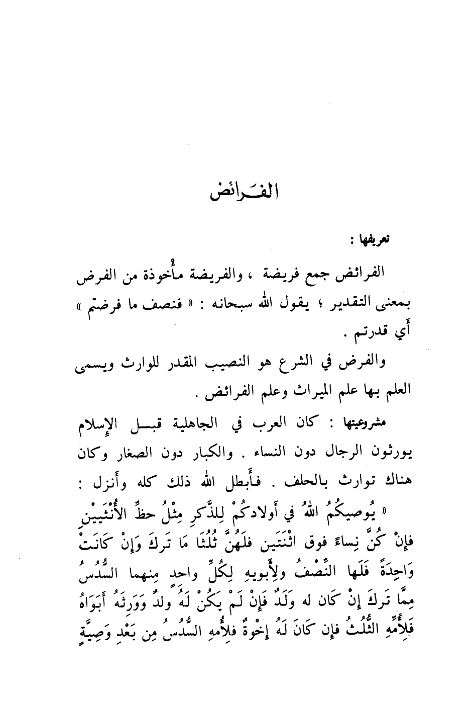 الفرائض جمع فريضة، والفريضة مأخوذة من الفرض بمعنى التقرير، يقول الله سبحانه: " فنصف ما فرضتم " أي قدرتم.