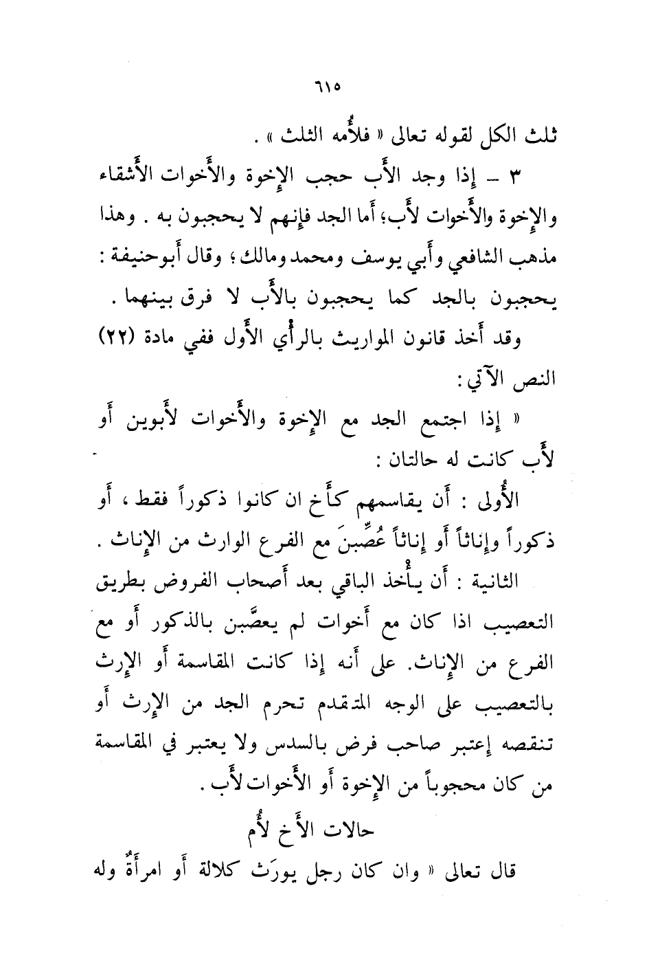 على أنه إذا كانت المقاسمة أو الارث التعصيب على الوجه المتقدم تحرم الجد من الارث أو تنقصه إعتبر صاحب فرض بالسدس ولا يعتبر في المقاسمة من كان محجوبا من الاخوة أو الاخوات لاب.