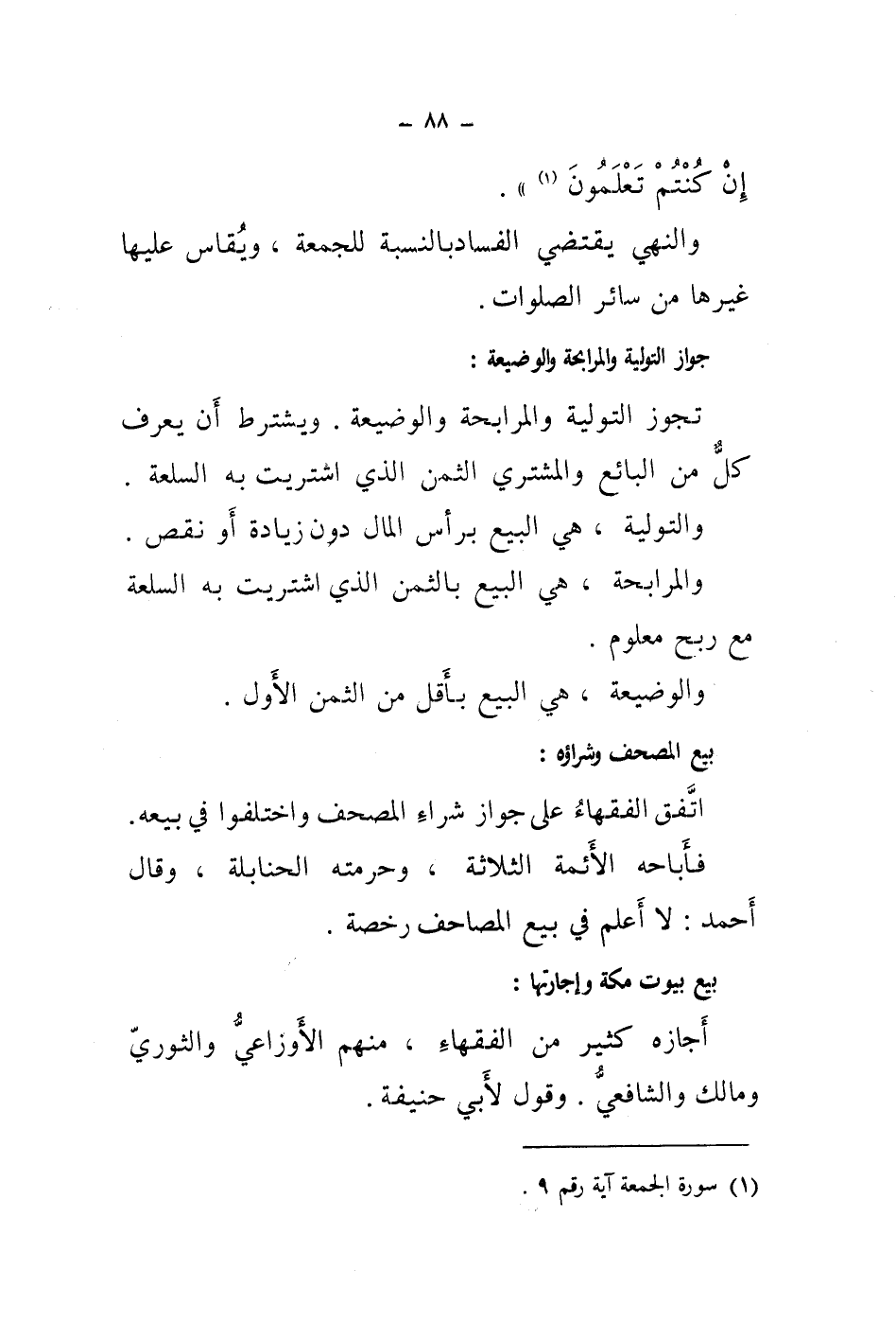 تجوز التولية والمرابحة والوضيعة. ويشترط أن يعرف كل من البائع والمشتري الثمن الذي اشتريت به السلعة.