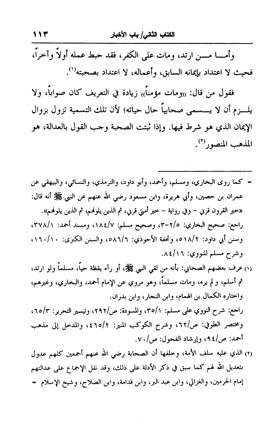 فقول من قال: "ومات مؤمنًا" زيادة في التعريف كان صوابًا، ولا يلزم أن لا يسمى صحابيًا حال حياته؛ لأن تلك التسمية تزول بزوال الإيمان الذي هو شرط فيها. وإذا ثبتت الصحبة وجب القول بالعدالة، هو المذهب المنصور (٢).