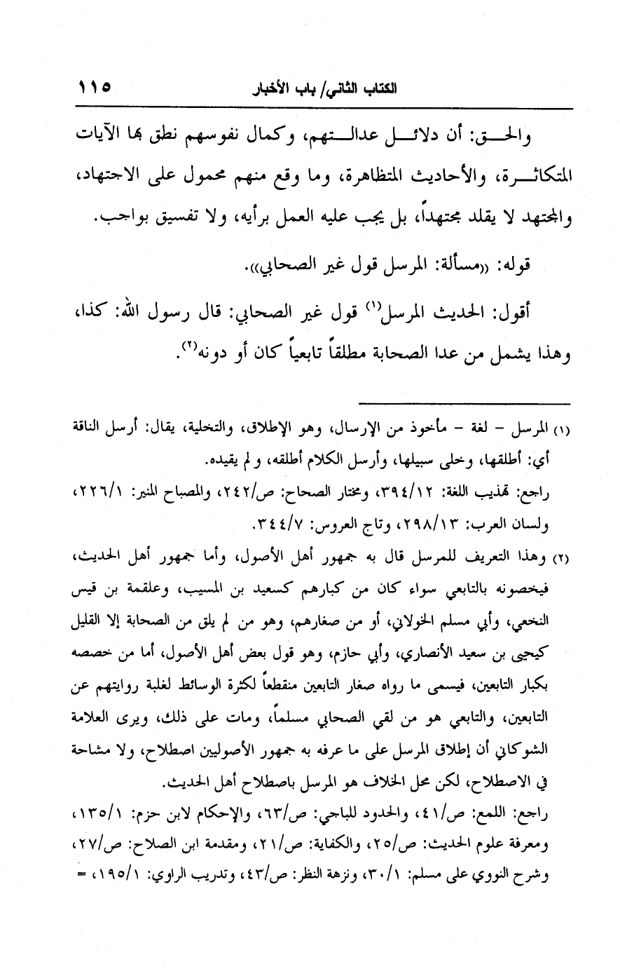 (٢) وهذا التعريف للمرسل قال به جمهور أهل الأصول، وأما جمهور أهل الحديث، فيخصونه بالتابعي سواء كان من كبارهم كسعيد بن المسيب، وعلقمة بن قيس النخعي، وأبي مسلم الخولاني، أو من صغارهم، وهو من لم يلق من الصحابة إلا القليل كيحيى بن سعيد الأنصاري، وأبي حازم، وهو قول بعض أهل الأصول، أما من خصصه بكبار التابعين، فيسمى ما رواه صغار التابعين منقطعًا لكثرة الوسائط لغلبة روايتهم عن التابعين، والتابعي هو من لقي الصحابي مسلمًا، ومات على ذلك، ويرى العلامة الشوكاني أن إطلاق المرسل على ما عرفه به جمهور الأصوليين اصطلاح، ولا مشاحة في الاصطلاح، لكن محل الخلاف هو المرسل باصطلاح أهل الحديث.