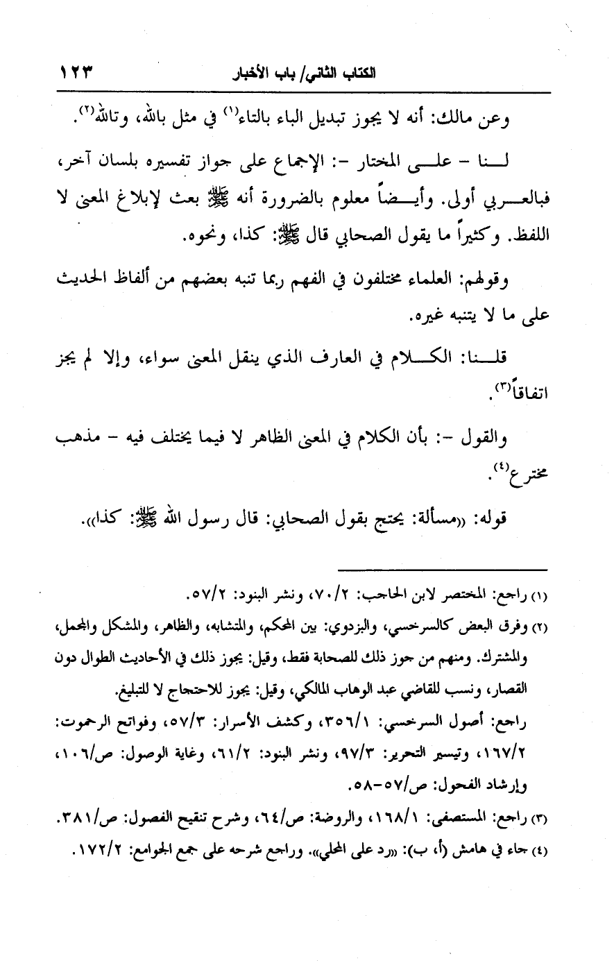 (٢) وفرق البعض كالسرخسي، والبزدوي: بين المحكم، والمتشابه، والظاهر، والمشكل والمجمل، والمشترك. ومنهم من جوز ذلك للصحابة فقط، وقيل: يجوز ذلك في الأحاديث الطوال دون القصار، ونسب للقاضي عبد الوهاب المالكي، وقيل: يجوز للاحتجاج لا للتبليغ.
