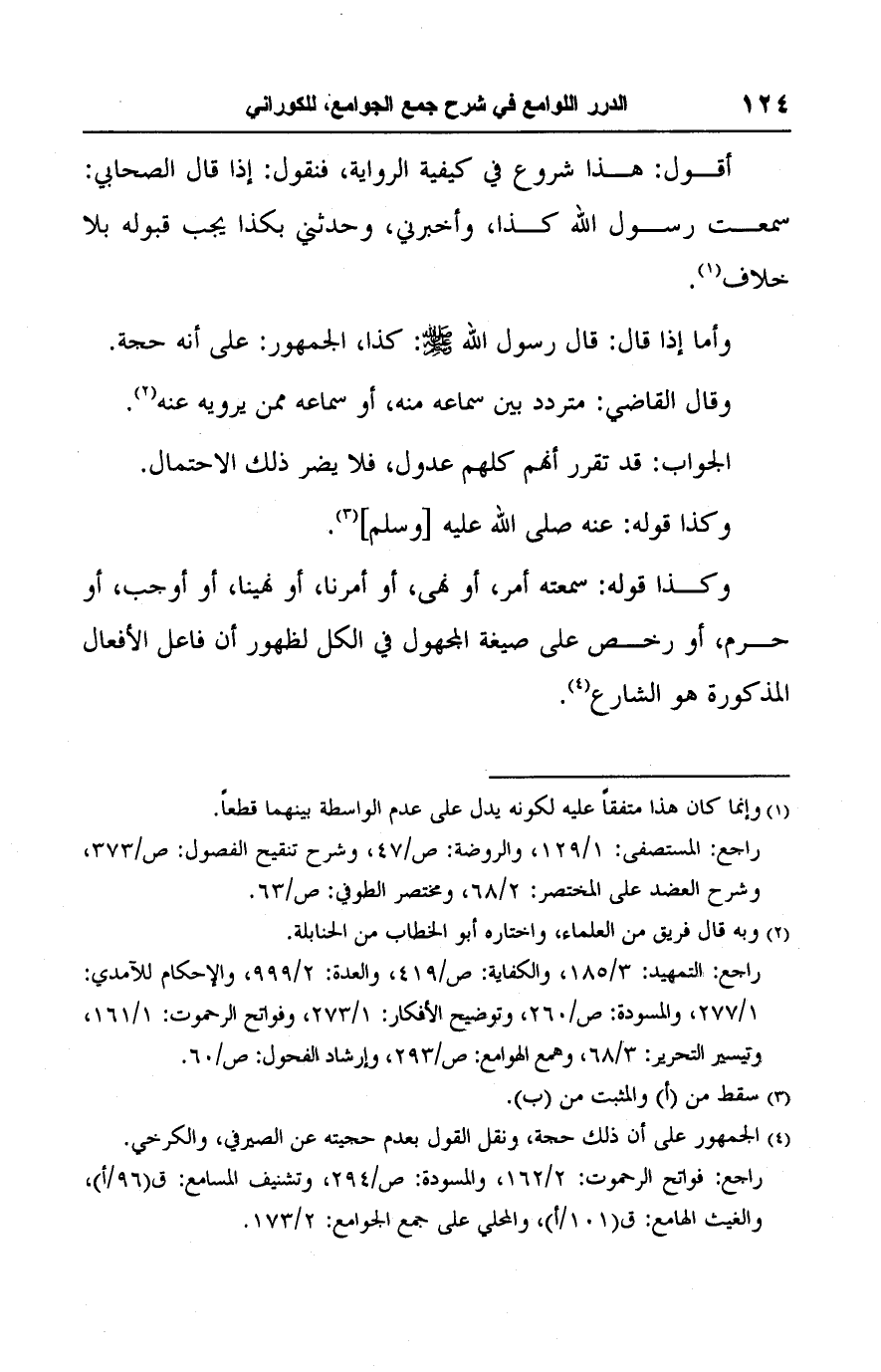 وكذا قوله: سمعته أمر، أو نهى، أو أمرنا، أو نهينا، أو أوجب، أو حرم، أو رخص على صيغة المجهول في الكل لظهور أن فاعل الأفعال المذكورة هو الشارع (٤).