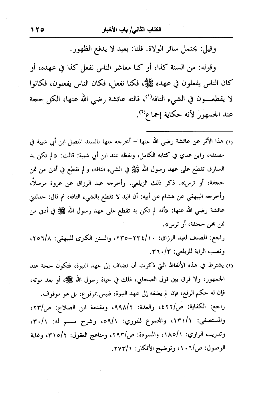 وقوله: من السنة كذا، أو كنا معاشر الناس نفعل كذا في عهده، أو كان الناس يفعلون في عهده - صلى الله عليه وسلم -، فكنا نفعل، فكان الناس يفعلون، فكانوا لا يقطعون في الشيء التافه (١)، قالته عائشة رضي الله عنها، الكل حجة عند الجمهور لأنه حكاية إجماع (٢).