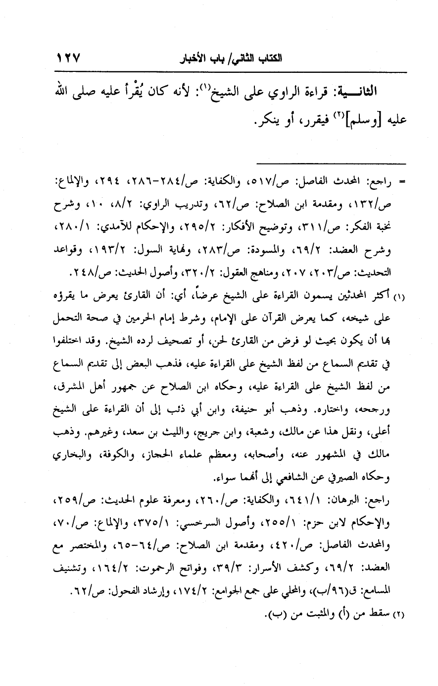 الثانية: قراءة الراوي على الشيخ (١): لأنه كان يُقْرأ عليه صلى الله عليه [وسلم] (٢) فيقرر، أو ينكر.