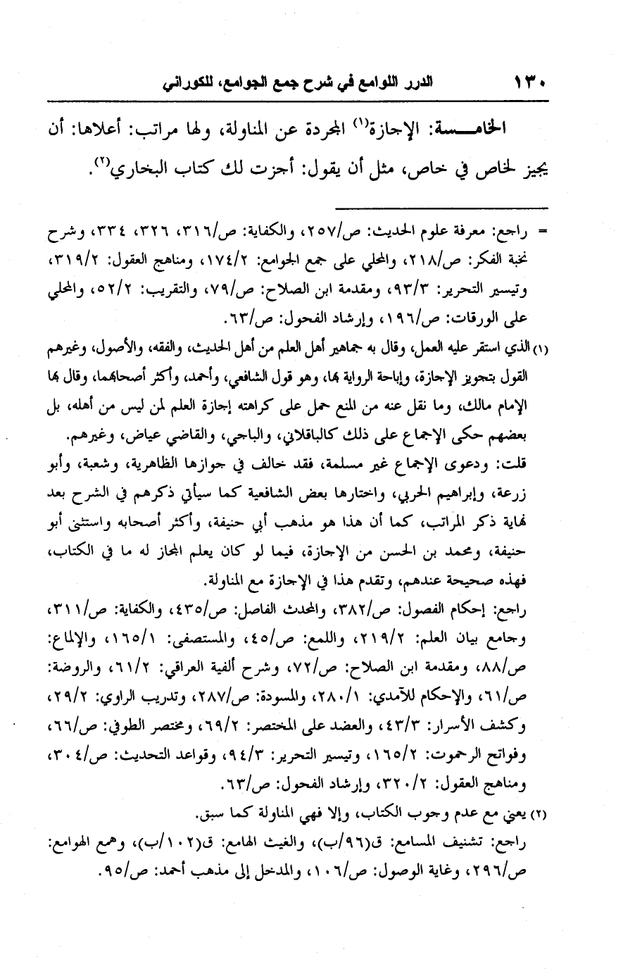 الخامسة: الإجازة (١) المجردة عن المناولة، ولها مراتب: أعلاها: أن يجيز لخاص في خاص، مثل أن يقول: أجزت لك كتاب البخاري (٢).