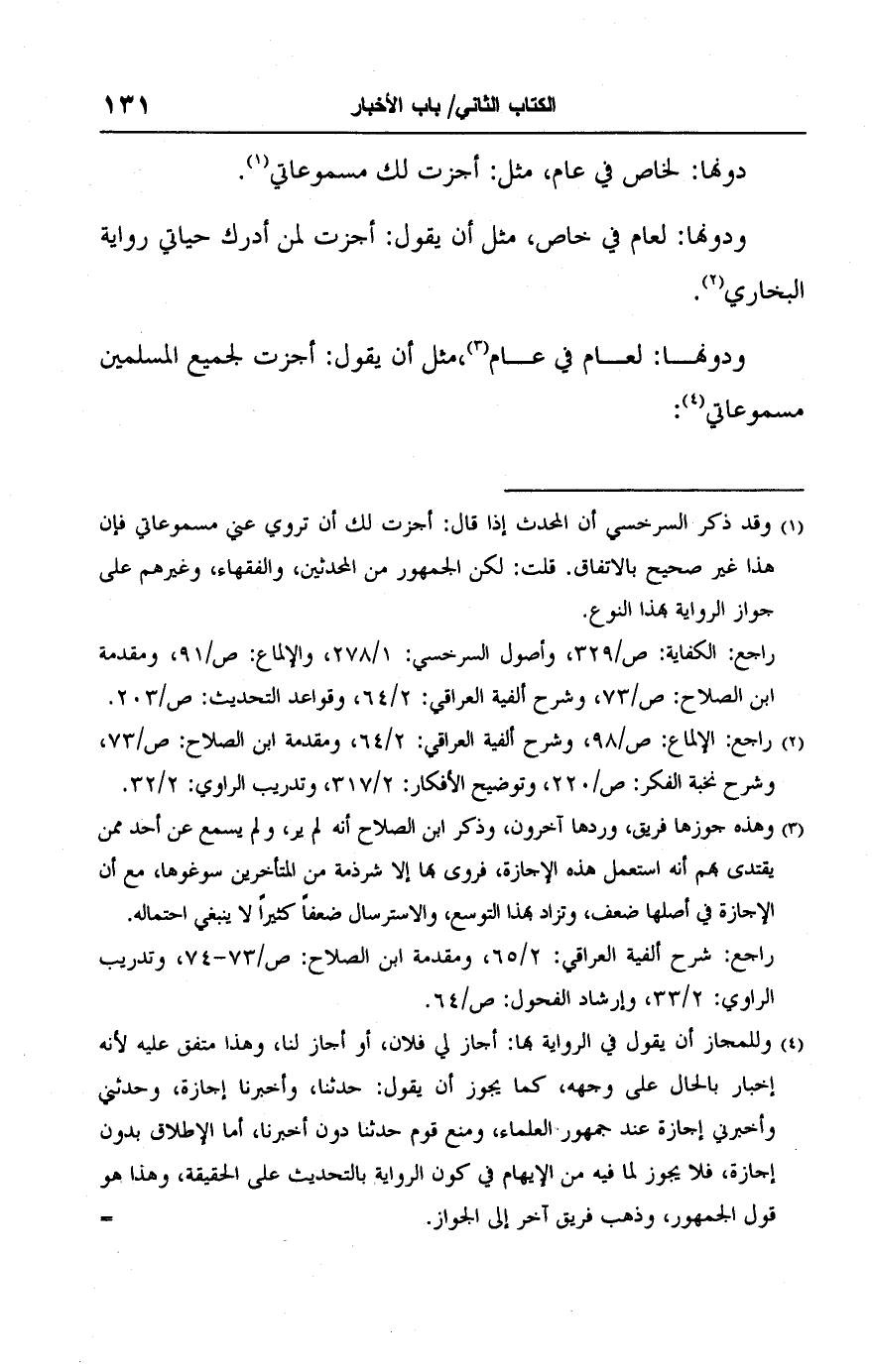 (١) وقد ذكر السرخسي أن المحدث إذا قال: أجزت لك أن تروي عني مسموعاتي فإن هذا غير صحيح بالإتفاق. قلت: لكن الجمهور من المحدثين، والفقهاء، وغيرهم على جواز الرواية بهذا النوع.