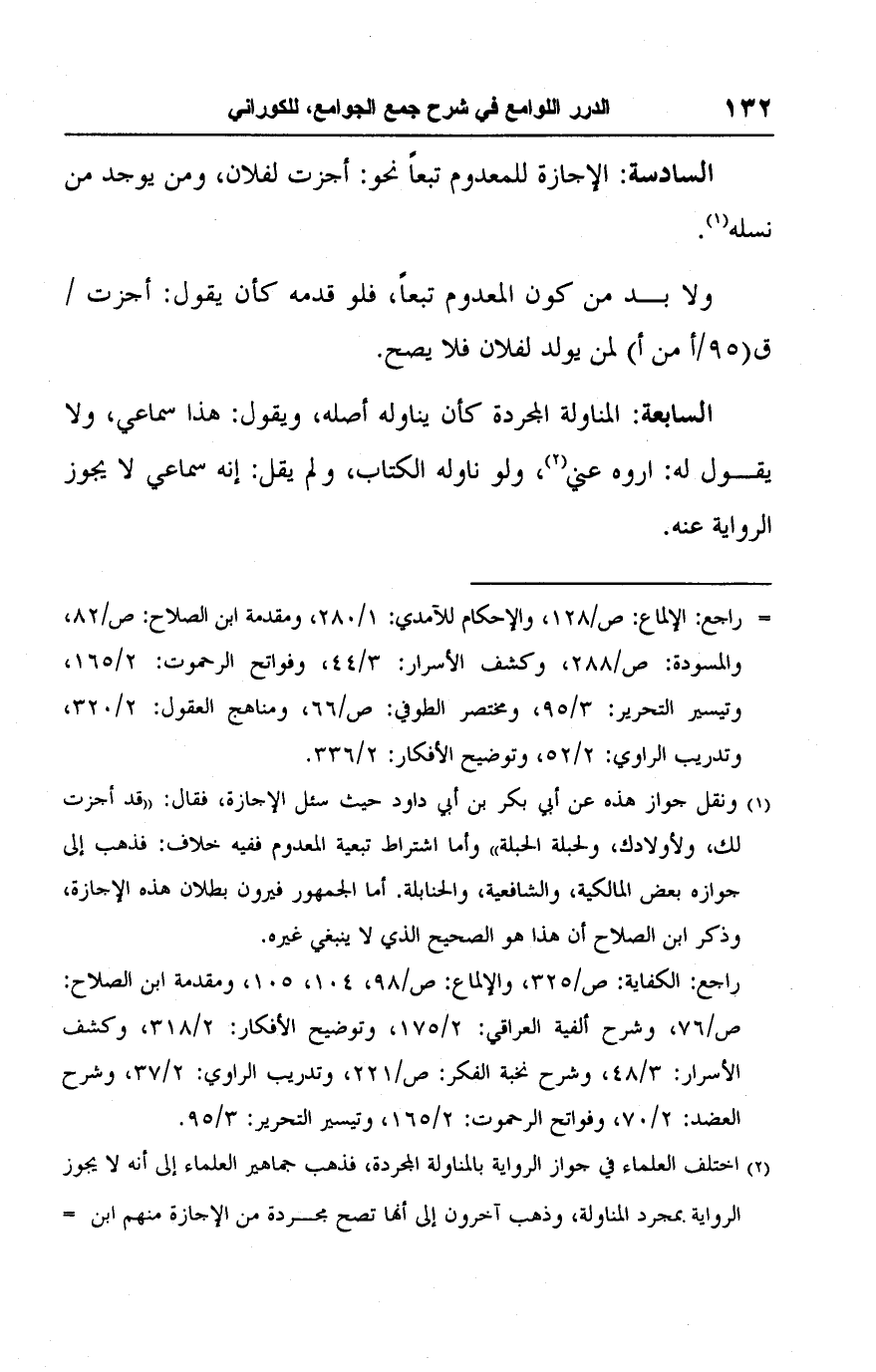 (١) ونقل جواز هذه عن أبي بكر بن أبي داود حيث سئل الإجازة، فقال: "قد أجزت لك، ولأولادك، ولحبلة الحبلة" وأما اشتراط تبعية المعدوم ففيه خلاف: فذهب إلى جوازه بعض المالكية، والشافعية، والحنابلة. أما الجمهور فيرون بطلان هذه الإجازة، وذكر ابن الصلاح أن هذا هو الصحيح الذي لا ينبغي غيره.