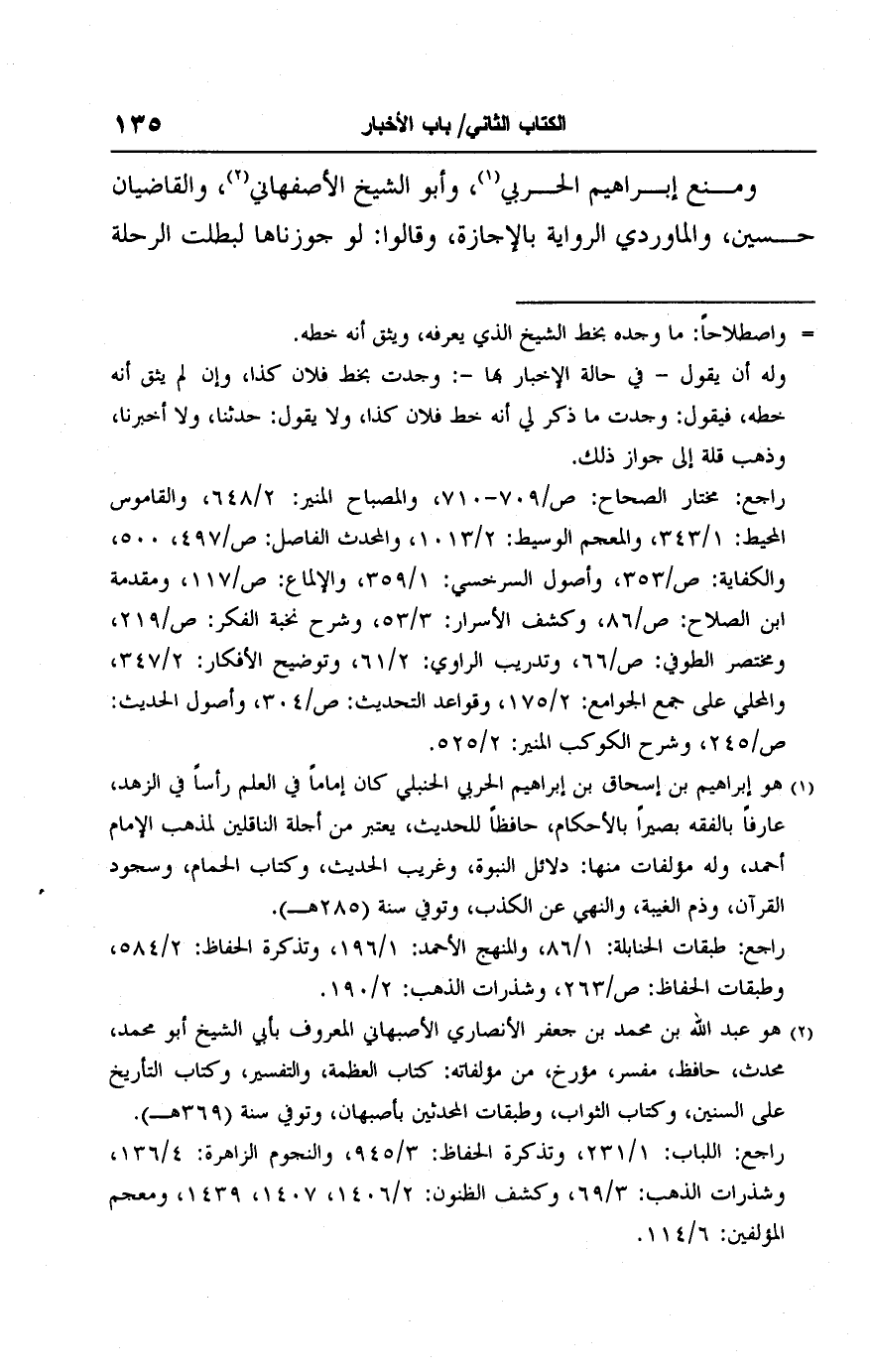ومنع إبراهيم الحربي (١)، وأبو الشيخ الأصفهاني (٢)، والقاضيان حسين، والماوردي الرواية بالإجازة، وقالوا: لو جوزناها لبطلت الرحلة