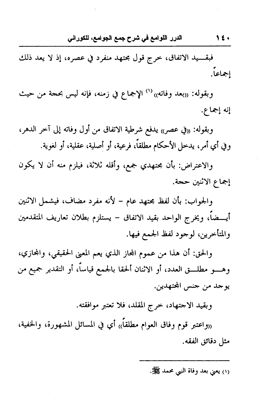 والجواب: بأن لفظ مجتهد عام - لأنه مفرد مضاف، فيشمل الاثنين أيضًا، ويخرج الواحد بقيد الاتفاق - يستلزم بطلان تعاريف المتقدمين والمتأخرين، لوجود لفظ الجمع فيها.