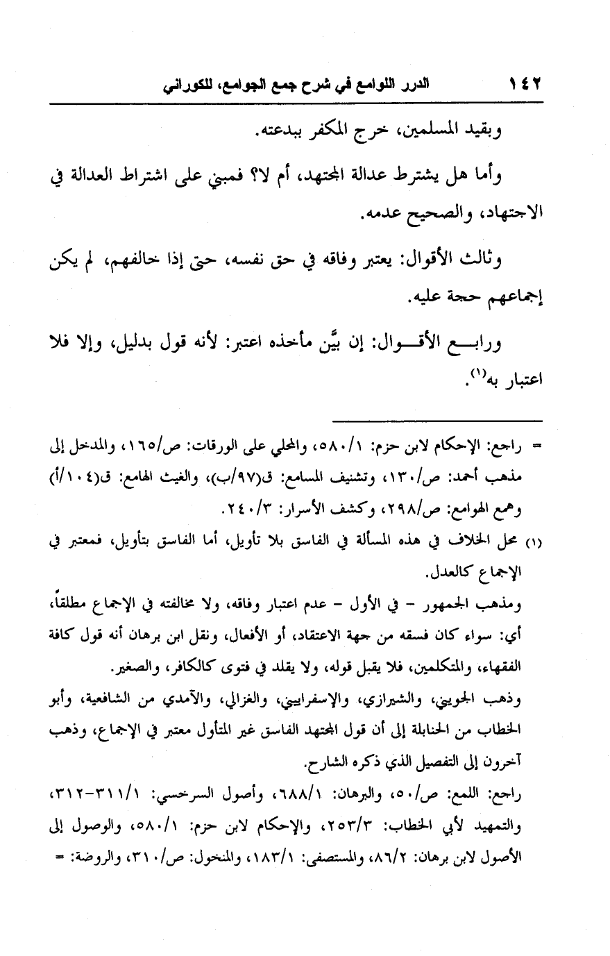 وذهب الجويني، والشيرازي، والإسفراييني، والغزالي، والآمدي من الشافعية، وأبو الخطاب من الحنابلة إلى أن قول المجتهد الفاسق غر المتأول معتبر في الإجماع، وذهب آخرون إلى التفصيل الذي ذكره الشارح.