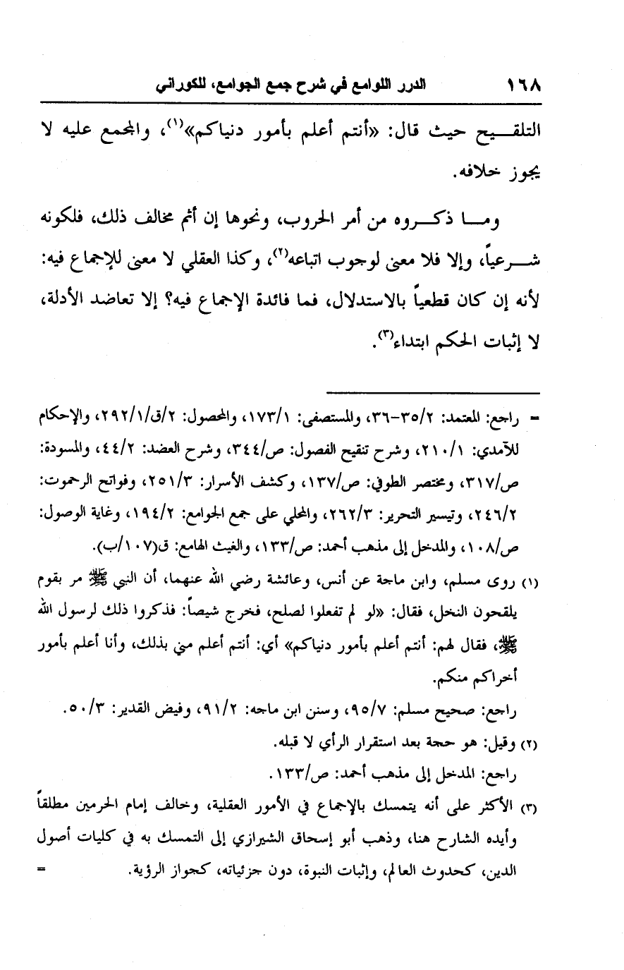 (٣) الأكثر على أنه يتمسك بالإجماع في الأمور العقلية، وخالف إمام الحرمين مطلقًا وأيده الشارح هنا، وذهب أبو إسحاق الشيرازي إلى التمسك به في كليات أصول الدين، كحدوث العالم، وإثبات النبوة، دون جزئياته، كجواز الرؤية. =