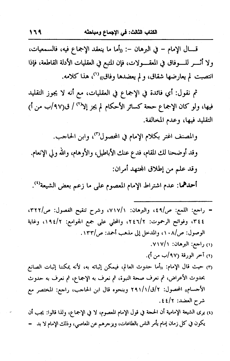 (٤) يرى الشيعة الإمامية أن الحجة في قول الإمام المعصوم، لا في الإجماع، ولذا قالوا: يجب أن يكون في كل زمان إمام يأمر الناس بالطاعات، ويزجرهم عن المعاصي، وذلك الإمام لا بد =