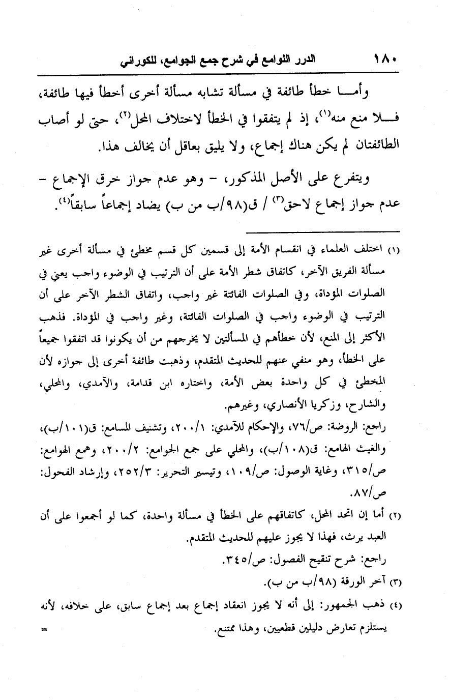 (١) اختلف العلماء في انقسام الأمة إلى قسمين كل قسم مخطئ في مسألة أخرى غير مسألة الفريق الآخر، كاتفاق شطر الأمة على أن الترتيب في الوضوء واجب يعني في الصلوات المؤداة، وفي الصلوات الفائتة غير واجب، واتفاق الشطر الآخر على أن الترتيب في الوضوء واجب في الصلوات الفائتة، وغير واجب في المؤداة. فذهب الأكثر إلى المنع، لأن خطأهم في المسألتين لا يخرجهم من أن يكونوا قد اتفقوا جميعًا على الخطأ، وهو منفي عنهم للحديث المتقدم، وذهبت طائفة أخرى إلى جوازه لأن المخطئ في كل واحدة بعض الأمة، واختاره ابن قدامة، والآمدي، والمحلي، والشارح، وزكريا الأنصاري، وغيرهم.