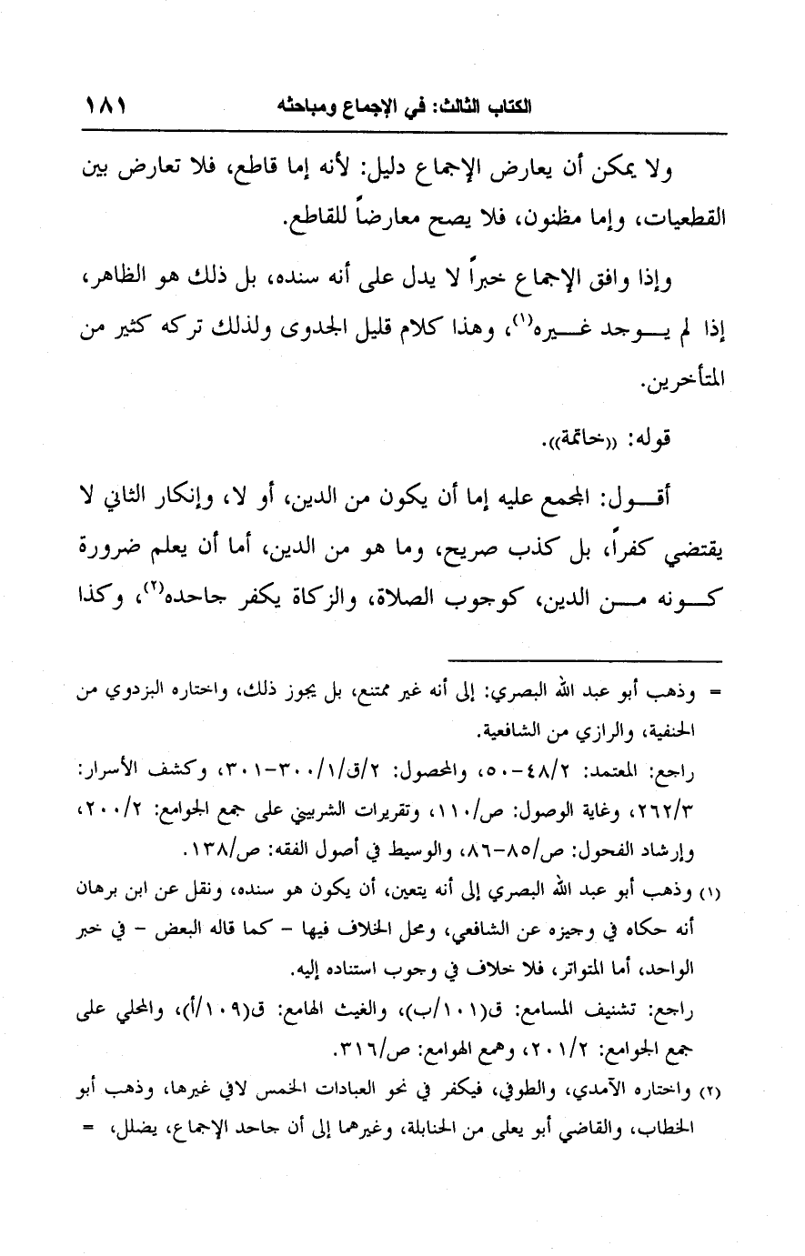(٢) واختاره الآمدي، والطوفي، فيكفر في نحو العبادات الخمس لا في غيرها، وذهب أبو الخطاب، والقاضي أبو يعلى من الحنابلة، وغيرهما إلى أن جاحد الإجماع، يضلل، =