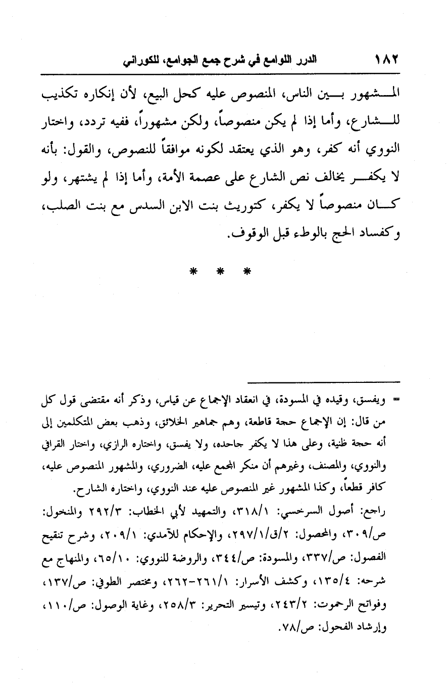 المشهور بين الناس، المنصوص عليه كحل البيع، لأن إنكاره تكذيب للشارع، وأما إذا لم يكن منصوصًا، ولكن مشهورًا، ففيه تردد، واختار النووي أنه كفر، وهو الذي يعتقد لكونه موافقًا للنصوص، والقول: بأنه لا يكفر يخالف نص الشارع على عصمة الأمة، وأما إذا لم يشتهر، ولو كان منصوصًا لا يكفر، كتوريث بنت الابن السدس مع بنت الصلب، وكفساد الحج بالوطء قبل الوقوف.