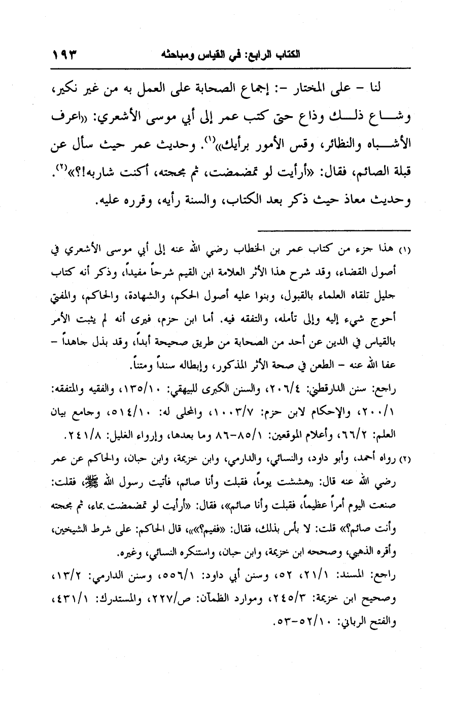 (١) هذا جزء من كتاب عمر بن الخطاب رضي الله عنه إلى أبي موسى الأشعري في أصول القضاء، وقد شرح هذا الأثر العلامة ابن القيم شرحًا مفيدًا، وذكر أنه كتاب جليل تلقاه العلماء بالقبول، وبنوا عليه أصول الحكم، والشهادة، والحاكم، والمفتي أحوج شيء إليه وإلى تأمله، والتفقه فيه. أما ابن حزم، فيرى أنه لم يثبت الأمر بالقياس في الدين عن أحد من الصحابة من طريق صحيحة أبدًا، وقد بذل جاهدًا - عفا الله عنه - الطعن في صحة الأثر المذكور، وإبطاله سندًا ومتنًا.