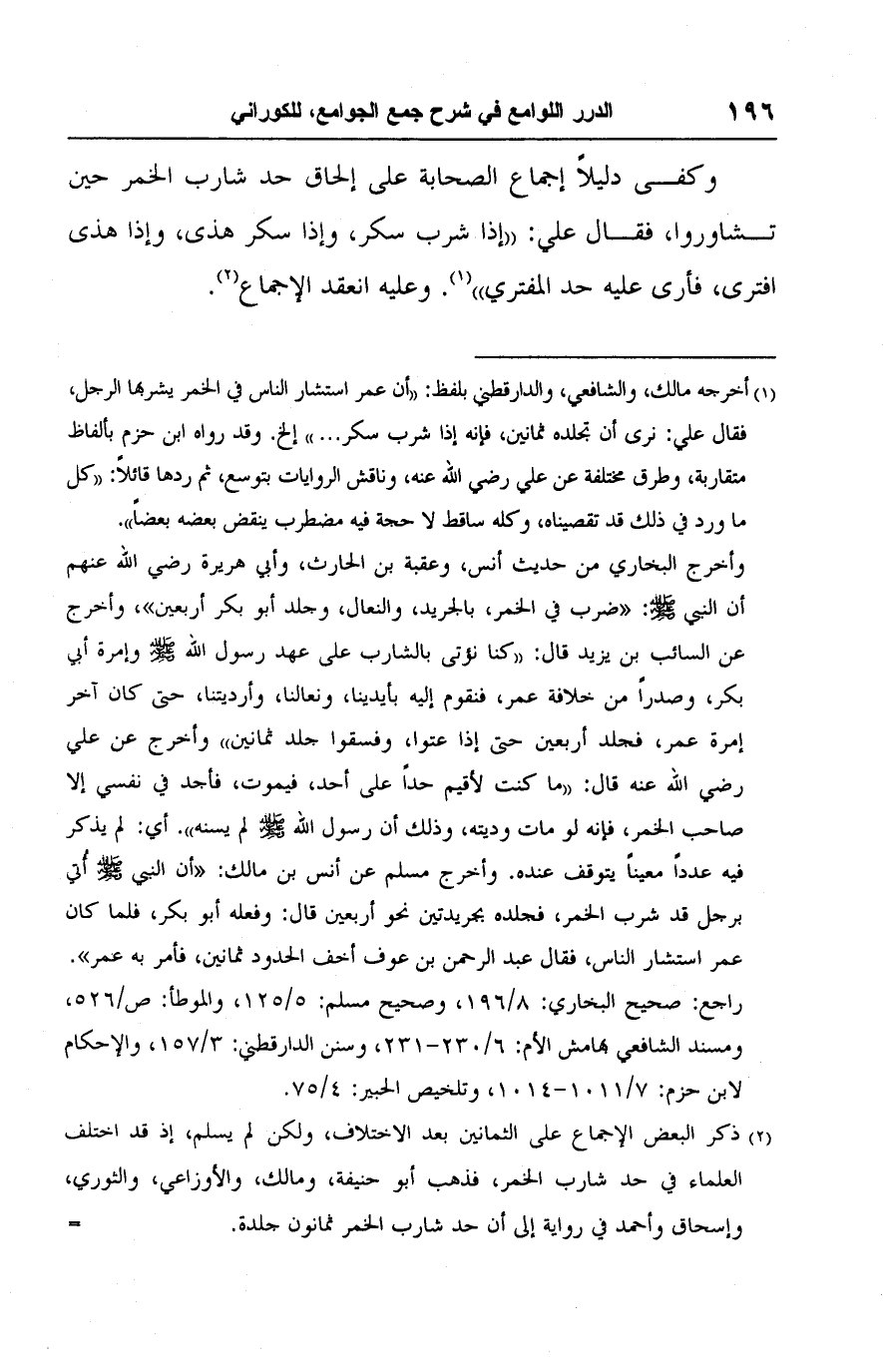 (١) أخرجه مالك، والشافعي، والدارقطني بلفظ: "أن عمر استشار الناس في الخمر يشربها الرجل، فقال علي: نرى أن تجلده ثمانين، فإنه إذا شرب سكر. . ." إلخ. وقد رواه ابن حزم بألفاظ متقاربة، وطرق مختلفة عن علي رضي الله عنه، وناقش الروايات بتوسع، ثم ردها قائلًا: "كل ما ورد في ذلك قد تقصيناه، وكله ساقط لا حجة فيه مضطرب ينقض بعضه بعضًا".