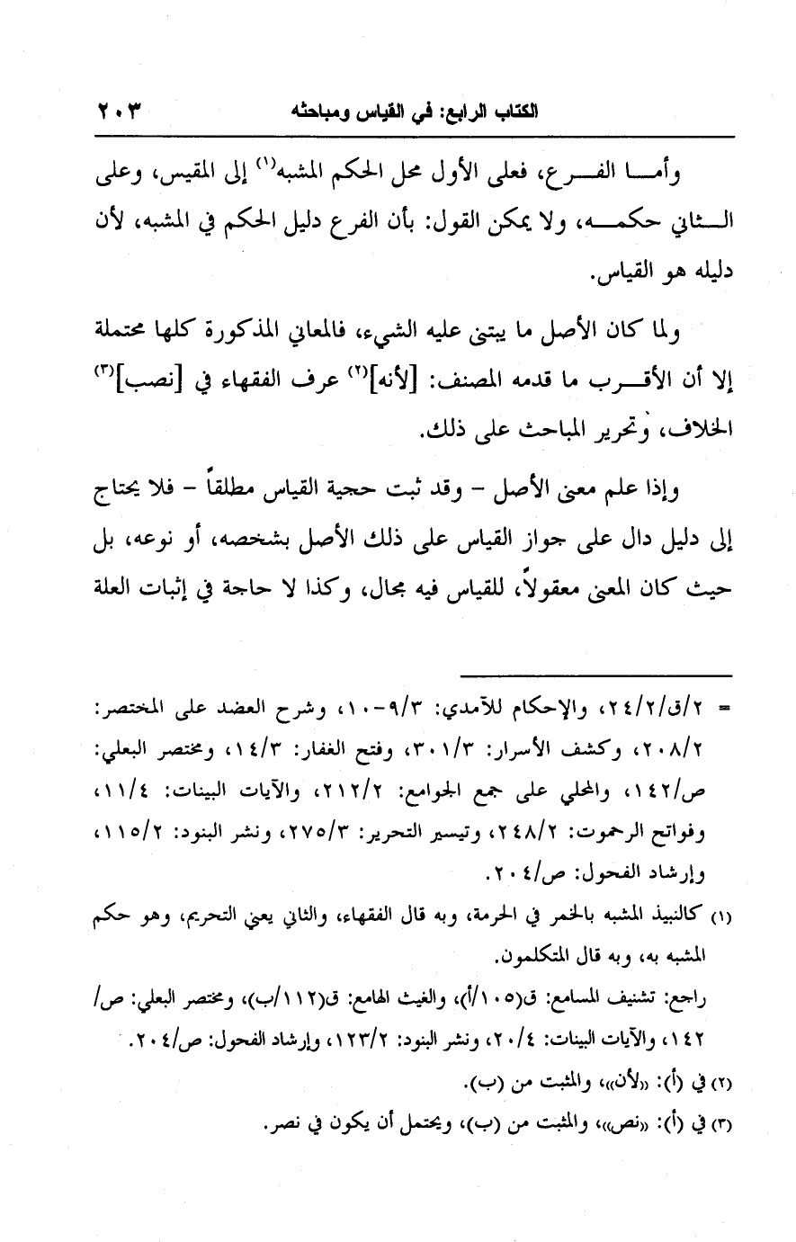 (١) كالنبيذ المشبه بالخمر في الحرمة، وبه قال الفقهاء، والثاني يعني التحريم، وهو حكم المشبه به، وبه قال المتكلمون.
