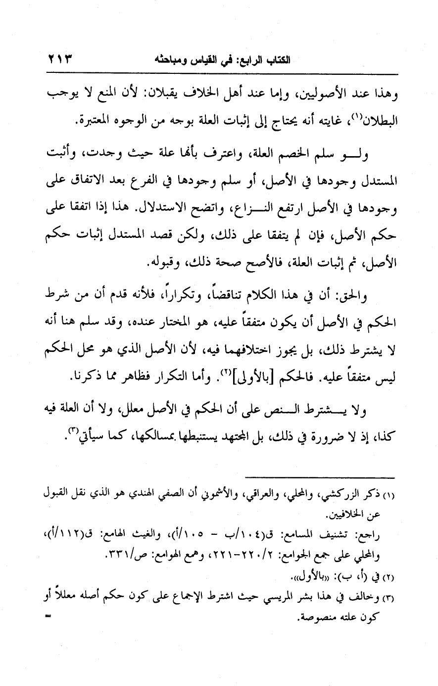 ولا يشترط النص على أن الحكم في الأصل معلل، ولا أن العلة فيه كذا، إذ لا ضرورة في ذلك، بل المجتهد يستنبطها. بمسالكها، كما سيأتي (٣).