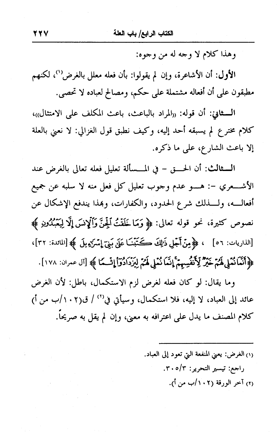 الثالث: أن الحق - في المسألة تعليل فعله تعالى بالغرض عند الأشعري -: هو عدم وجوب تعليل كل فعل منه لا سلبه عن جميع أفعاله، ولذلك شرع الحدود، والكفارات، وبهذا يندفع الإشكال عن نصوص كثيرة، نحو قوله تعالى: {وَمَا خَلَقْتُ الْجِنَّ وَالْإِنْسَ إِلَّا لِيَعْبُدُونِ} [الذاريات: ٥٦]، {مِنْ أَجْلِ ذَلِكَ كَتَبْنَا عَلَى بَنِي إِسْرَائِيلَ} [المائدة: ٣٢]، {أَنَّمَا نُمْلِي لَهُمْ خَيْرٌ لِأَنْفُسِهِمْ إِنَّمَا نُمْلِي لَهُمْ لِيَزْدَادُوا إِثْمًا} [آل عمران: ١٧٨].