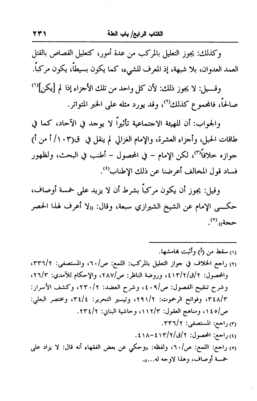 (٢) راجع الخلاف في جواز التعليل بالمركب: اللمع: ص/ ٦٠، والمستصفى: ٢/ ٣٣٦، والمحصول: ٢/ ق/ ٢/ ٤١٣، وروضة الناظر: ص/ ٢٨٧، والإحكام للآمدي: ٣/ ٢٦، وشرح تنقيح الفصول: ص/ ٤٠٩، وشرح العضد: ٢/ ٢٣٠، وكشف الأسرار: ٣/ ٣٤٨، وفواتح الرحموت: ٢/ ٢٩١، وتيسير التحرير: ٤/ ٣٤، ومختصر البعلي: ص/ ١٤٥، ومناهج العقول: ٣/ ١١٢، وحاشية البناني: ٢/ ٢٣٤.