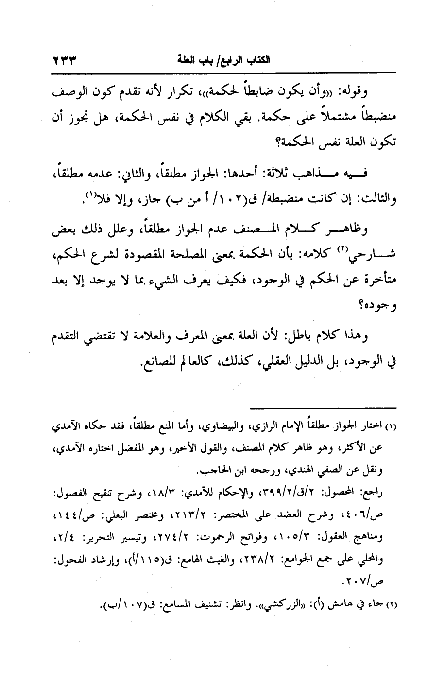 وظاهر كلام المصنف عدم الجواز مطلقًا، وعلل ذلك بعض شارحي (٢) كلامه: بأن الحكمة بمعنى المصلحة المقصودة لشرع الحكم، متأخرة عن الحكم في الوجود، فكيف يعرف الشيء بما لا يوجد إلا بعد وجوده؟