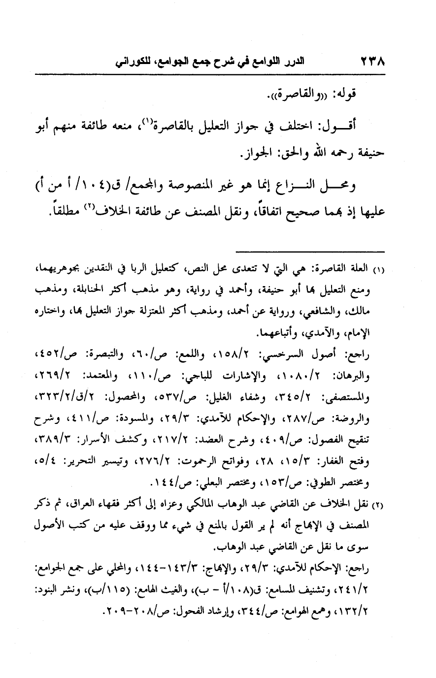 (١) العلة القاصرة: هي التي لا تتعدى محل النص، كتعليل الربا في النقدين بجوهريهما، ومنع التعليل بها أبو حنيفة، وأحمد في رواية، وهو مذهب أكثر الحنابلة، ومذهب مالك، والشافعي، ورواية عن أحمد، ومذهب أكثر المعتزلة جواز التعليل بها، واختاره الإمام، والآمدي، وأتباعهما.