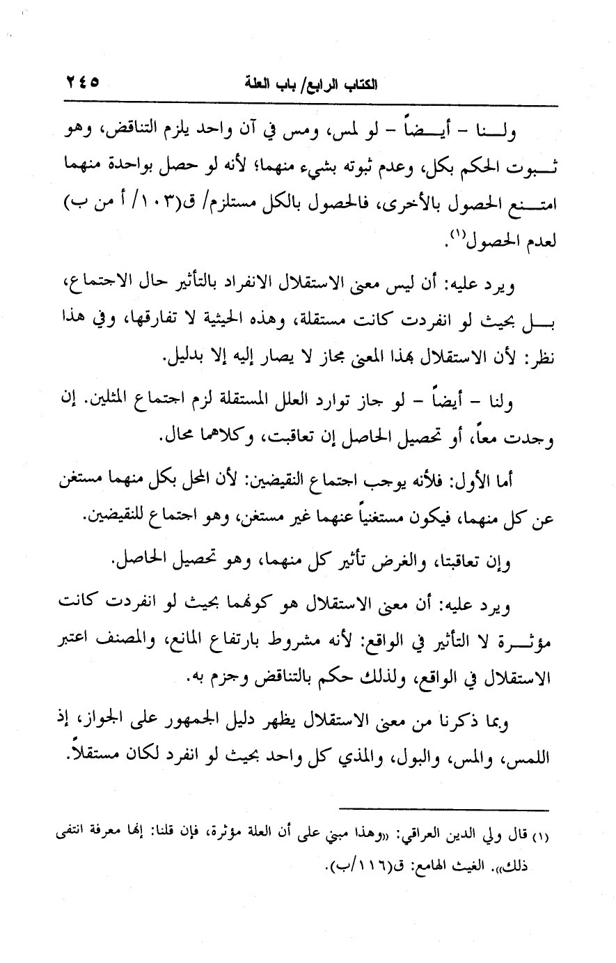 ولنا - أيضًا - لو جاز توارد العلل المستقلة لزم اجتماع المثلين. إن وجدت معًا، أو تحصيل الحاصل إن تعاقبت، وكلاهما محال.