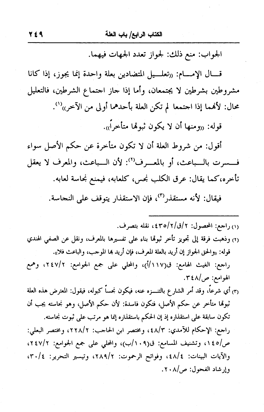 (٢) وذهبت فرقة إلى تجويز تأخر ثبوتها بناء على تفسيرها بالمعرف، ونقل عن الصفي الهندي قوله: "والحق الجواز إن أريد بالعلة المعرف، فإن أريد بها الموجب، والباعث فلا".