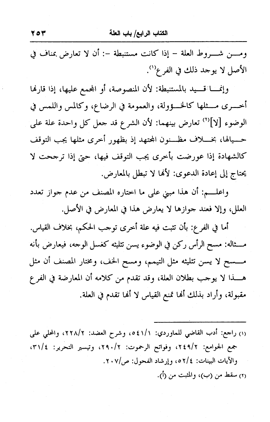 أما في الفرع: بأن تثبت فيه علة أخرى توجب الحكم، بخلاف القياس. مثاله: مسح الرأس ركن في الوضوء يسن تثليثه كغسل الوجه، فيعارض بأنه مسح لا يسن تثليثه مثل التيمم، ومسح الخف، ومختار المصنف أن مثل هذا لا يوجب بطلان العلة، وقد تقدم من كلامه أن المعارضة في الفرع مقبولة، وأراد بذلك أنها تمنع القياس لا أنها تقدم في العلة.
