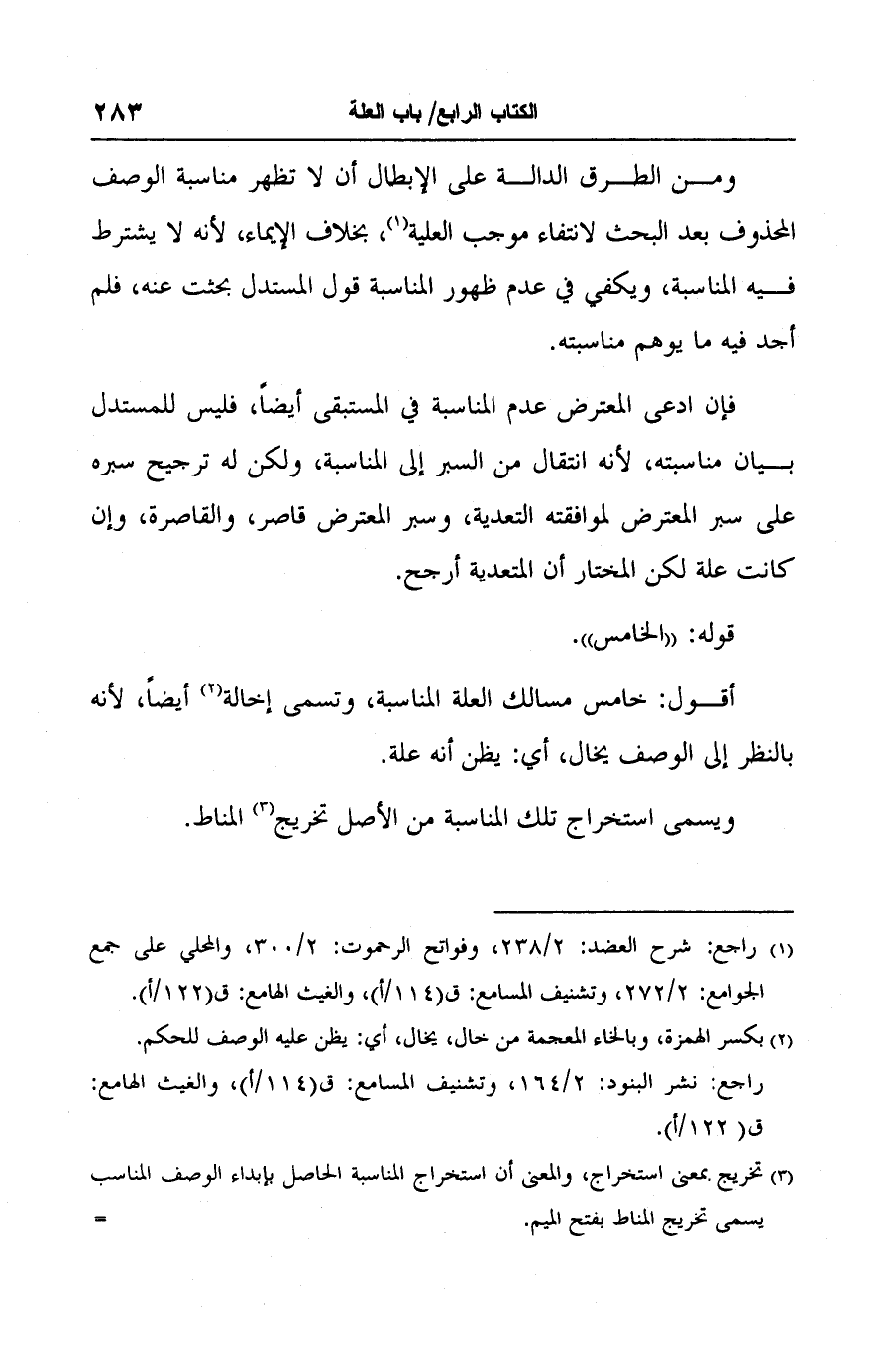 (٣) تخريج بمعنى استخراج، والمعنى أن استخراج المناسبة الحاصل بإبداء الوصف المناسب يسمى تخريج المناط بفتح الميم. =
