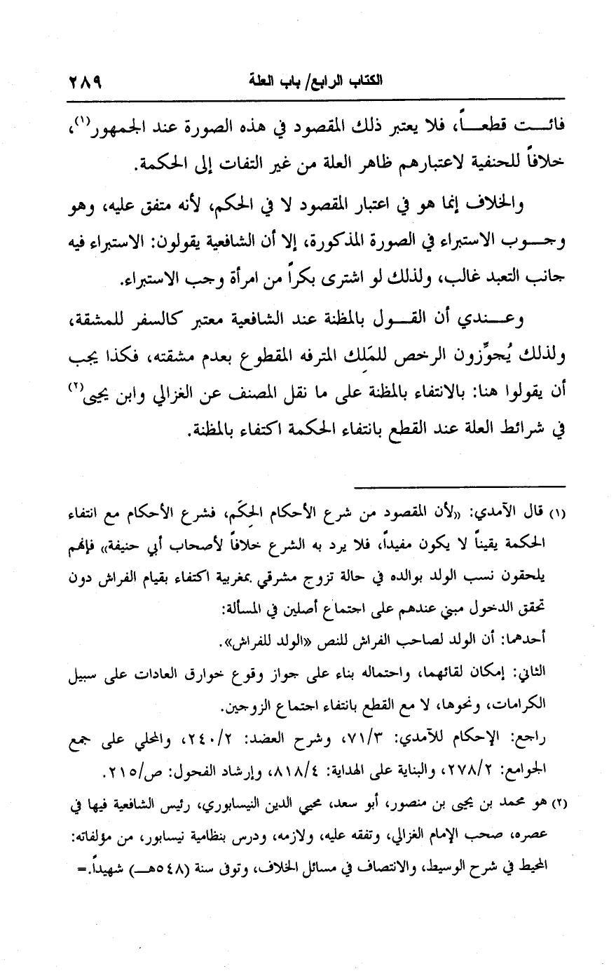 (١) قال الآمدي: "لأن المقصود من شرع الأحكام الحكَم، فشرع الأحكام مع انتفاء الحكمة يقينًا لا يكون مفيدًا، فلا يرد به الشرع خلافًا لأصحاب أبي حنيفة" فإنهم يلحقون نسب الولد بوالده في حالة تزوج مشرقي بمغربية اكتفاء بقيام الفراش دون تحقق الدخول مبني عندهم على اجتماع أصلين في المسألة: