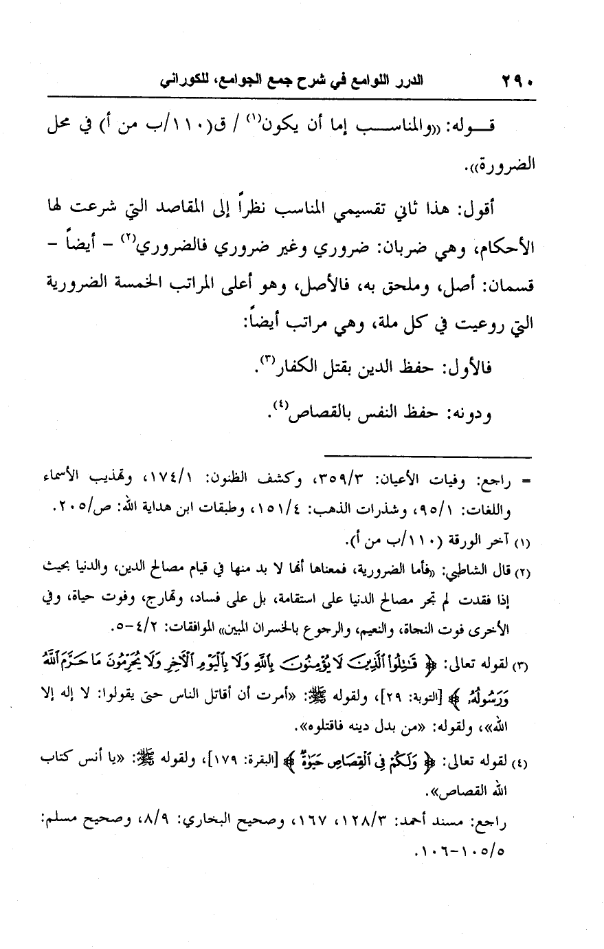 (٢) قال الشاطبي: "فأما الضرورية، فمعناها أنها لا بد منها في قيام مصالح الدين، والدنيا بحيث إذا فقدت لم تجر مصالح الدنيا على استقامة، بل على فساد، وتهارج، وفوت حياة، وفي الأخرى فوت النجاة، والنعيم، والرحوع بالخسران المبين" الموافقات: ٢/ ٤ - ٥.