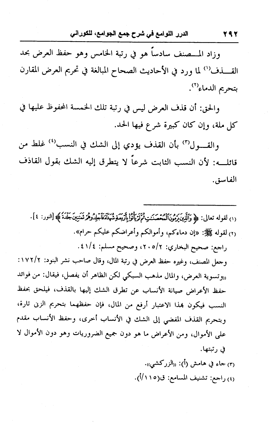 وجعل المصنف، وغيره حفظ العرض في رتبة المال، وقال صاحب نشر البنود: ٢/ ١٧٢: "وتسوية العرض، والمال مذهب السبكي لكن الظاهر أن يفصل، فيقال: من فوائد حفظ الأعراض صيانة الأنساب عن تطرق الشك إليها بالقذف، فيلحق بحفظ النسب فيكون بهذا الاعتبار أرفع من المال، فإن حفظهما بتحريم الزنى تارة، وبتحريم القذف المفضي إلى الشك في الأنساب أخرى، وحفظ الأنساب مقدم على الأموال، ومن الأعراض ما هو دون جميع الضروريات وهو دون الأموال لا في رتبتها.