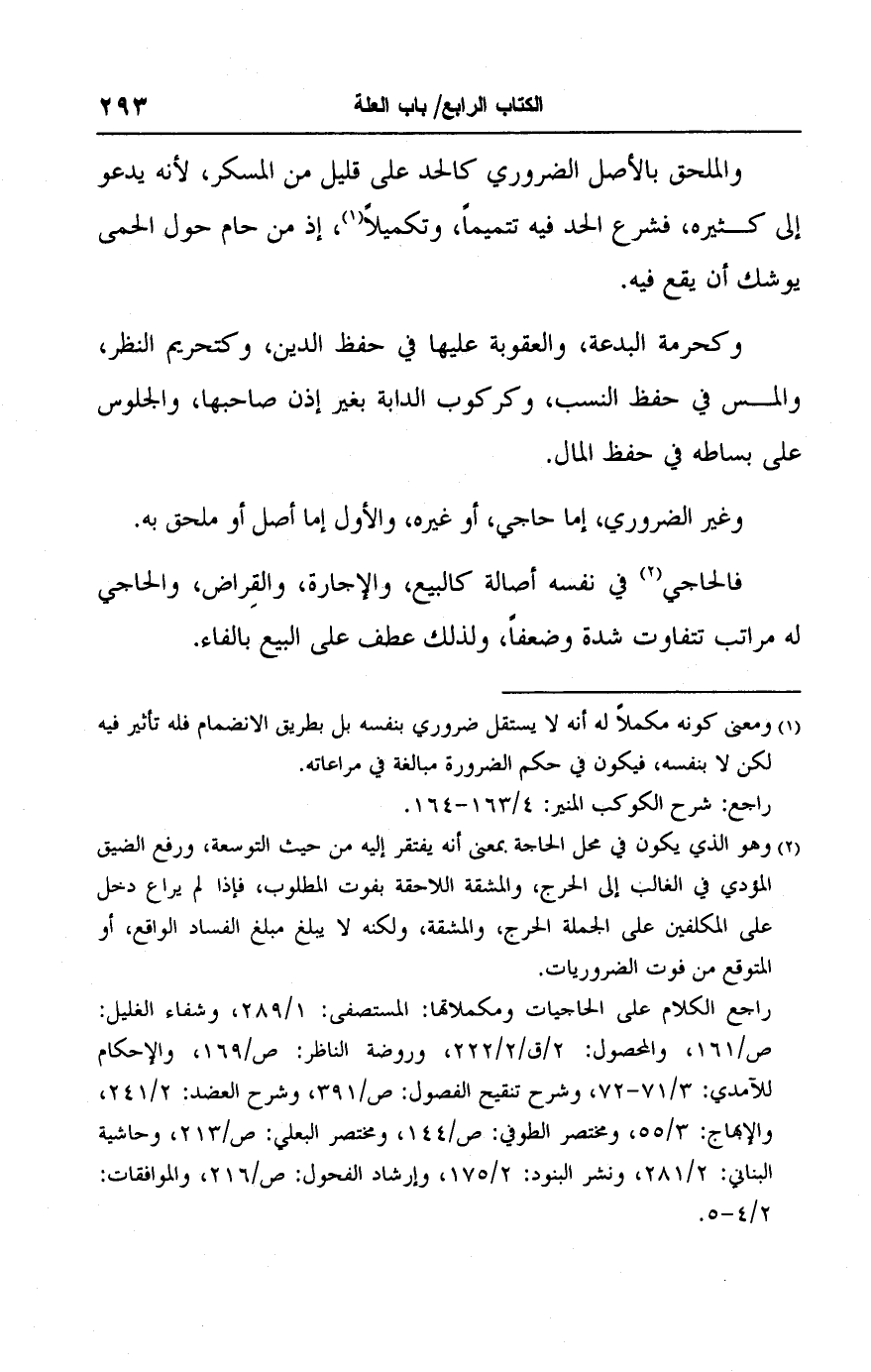 راجع الكلام على الحاجيات ومكملاتها: المستصفى: ١/ ٢٨٩، وشفاء الغليل: ص/ ١٦١، والمحصول: ٢/ ق/ ٢/ ٢٢٢، وروضة الناظر: ص/ ١٦٩، والإحكام للآمدي: ٣/ ٧١ - ٧٢، وشرح تنقيح الفصول: ص/ ٣٩١، وشرح العضد: ٢/ ٢٤١، والإبهاج: ٣/ ٥٥، ومختصر الطرفي: ص/ ١٤٤، ومختصر البعلي: ص/ ٢١٣، وحاشية البناني: ٢/ ٢٨١، ونشر البنود: ٢/ ١٧٥، وإرشاد الفحول: ص/ ٢١٦، والموافقات: ٢/ ٤ - ٥.