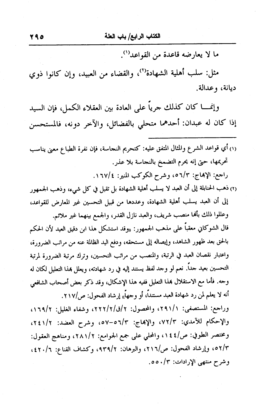 (٢) ذهب الحنابلة إلى أن العبد لا يسلب أهلية الشهادة بل تقبل في كل شيء، وذهب الجمهور إلى أن العبد يسلب أهلية الشهادة، وعددها من قبيل التحسين غير المعارض للقواعد، وعللوا ذلك بأنها منصب شريف، والعبد نازل القدر، والجمع بينهما غير ملائم.