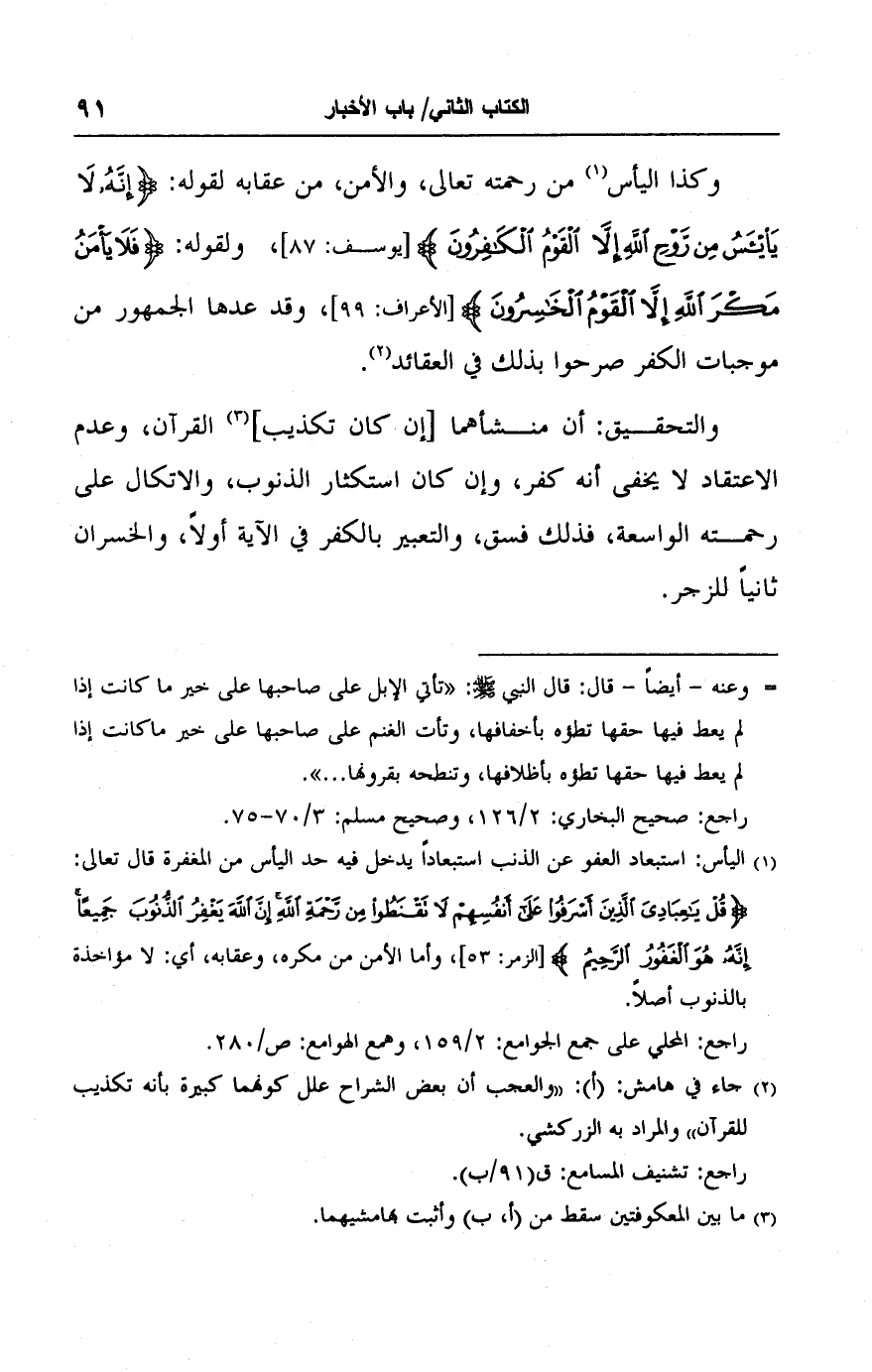 (٢) جاء في هامش: (أ): "والعجب أن بعض الشراح علل كونهما كبيرة بأنه تكذيب للقرآن" والمراد به الزركشي.
