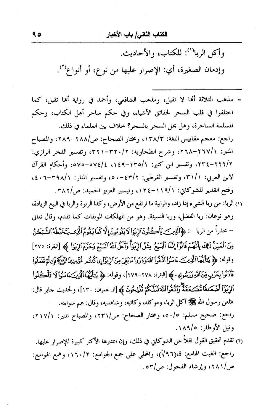 (١) الربا: من ربا الشيء إذا زاد، والرابية ما ارتفع من الأرض، وكذا الربوة والربا في البيع الزيادة، وهو نوعان: ربا الفضل، وربا النسيئة. وهو من المهلكات الموبقات كما تقدم، وقال تعالى - محذرًا من الربا -: {الَّذِينَ يَأْكُلُونَ الرِّبَا لَا يَقُومُونَ إِلَّا كَمَا يَقُومُ الَّذِي يَتَخَبَّطُهُ الشَّيْطَانُ مِنَ الْمَسِّ ذَلِكَ بِأَنَّهُمْ قَالُوا إِنَّمَا الْبَيْعُ مِثْلُ الرِّبَا وَأَحَلَّ اللَّهُ الْبَيْعَ وَحَرَّمَ الرِّبَا} [البقرة: ٢٧٥] وقوله: {يَاأَيُّهَا الَّذِينَ آمَنُوا اتَّقُوا اللَّهَ وَذَرُوا مَا بَقِيَ مِنَ الرِّبَا إِنْ كُنْتُمْ مُؤْمِنِينَ (٢٧٨) فَإِنْ لَمْ تَفْعَلُوا فَأْذَنُوا بِحَرْبٍ مِنَ اللَّهِ وَرَسُولِهِ} [البقرة: ٢٧٨، ٢٧٩]، وقوله: {يَاأَيُّهَا الَّذِينَ آمَنُوا لَا تَأْكُلُوا الرِّبَا أَضْعَافًا مُضَاعَفَةً وَاتَّقُوا اللَّهَ لَعَلَّكُمْ تُفْلِحُونَ} [آل عمران: ١٣٠]، ولحديث جابر قال: "لعن رسول الله - صلى الله عليه وسلم - آكل الربا، وموكله، وكاتبه، وشاهديه، وقال: هم سواء".