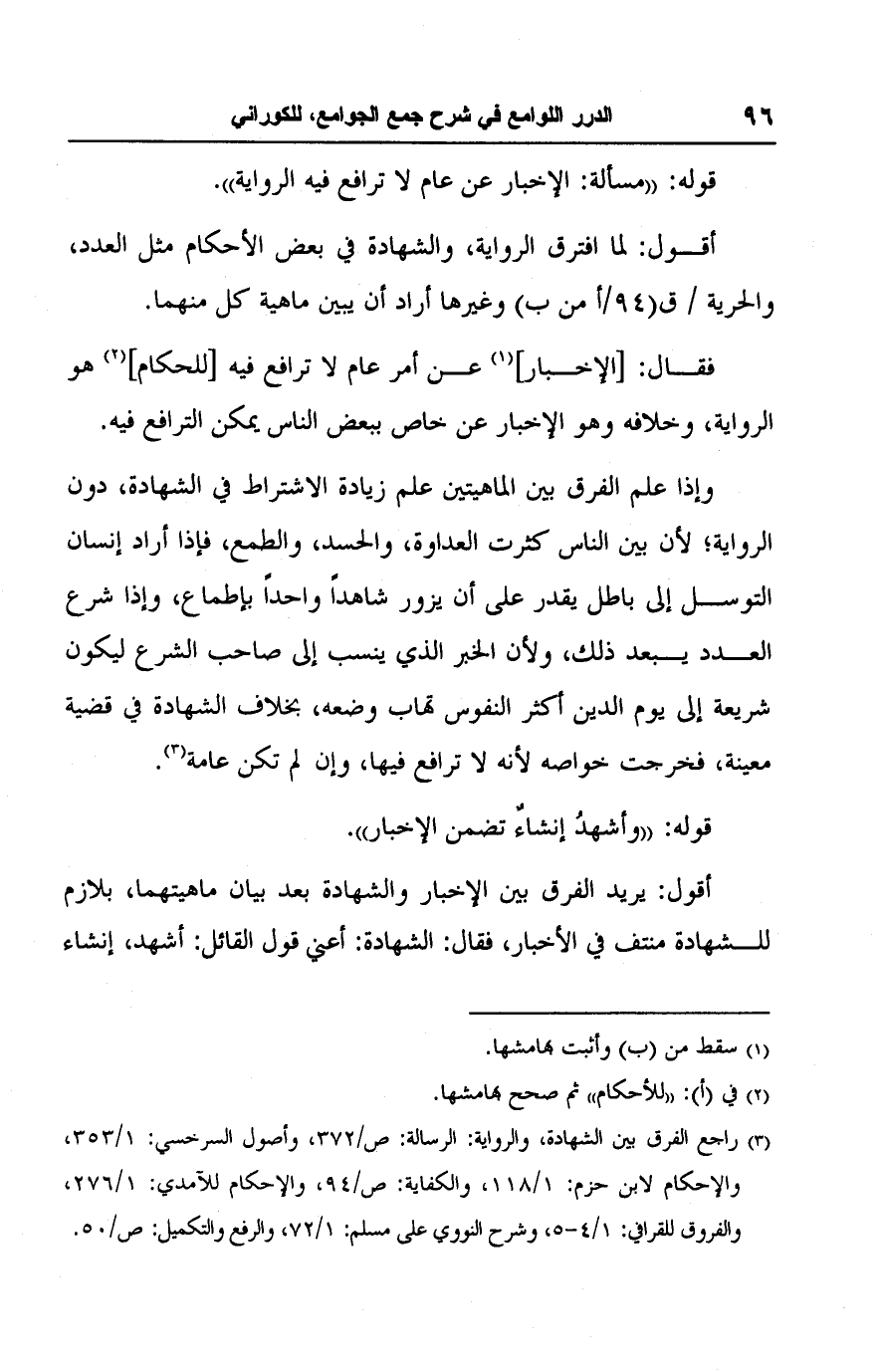 (٣) راجع الفرق بين الشهادة، والرواية: الرسالة: ص/ ٣٧٢، وأصول السرخسي: ١/ ٣٥٣، والإحكام لابن حزم: ١/ ١١٨، والكفاية: ص/ ٩٤، والإحكام للآمدي: ١/ ٢٧٦، والفروق للقرافي: ١/ ٤ - ٥، وشرح النووي على مسلم: ١/ ٧٢، والرفع والتكميل: ص/ ٥٠.
