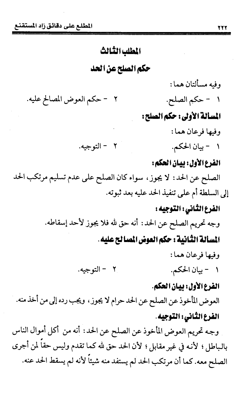 الصلح عن الحد: لا يجوز، سواء كان الصلح على عدم تسليم مرتكب الحد إلى السلطة أم على تنفيذ الحد عليه بعد ثبوته.