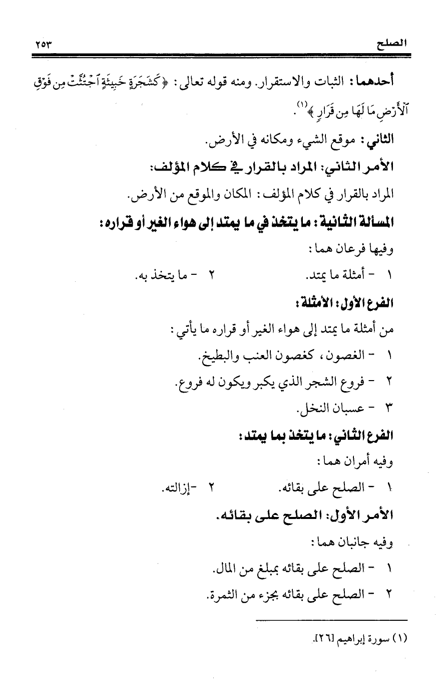 أحدهما: الثبات والاستقرار. ومنه قوله تعالى: {كَشَجَرَةٍ خَبِيثَةٍ اجْتُثَّتْ مِنْ فَوْقِ الْأَرْضِ مَا لَهَا مِنْ قَرَارٍ} (¬1).